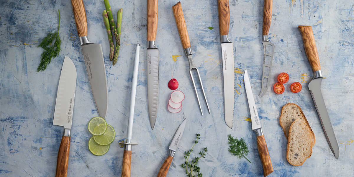 Oliva Elite knife collection by Messermeister boasts an exquisite natural, Mediterranean olive wood handle in the popular straight tang, forged knife line series. The highly figured, beautiful golden-brown handle provides a secure ergonomic pinch grip with an unsurpassed balance. The blade, bolster and tang are one piece, hot-drop hammer forged from a single billet of the finest German 1.4116 steel alloy and heat treated and cooled to achieve a Rockwell of 57-58. The 15° Elite edge is hand stropped on a cloth wheel, creating the sharpest possible cutting surface on an edged tool. Oliva Elite knives are of heirloom quality and one of the best original forged wood handle knives. Handcrafted in Solingen, Germany.